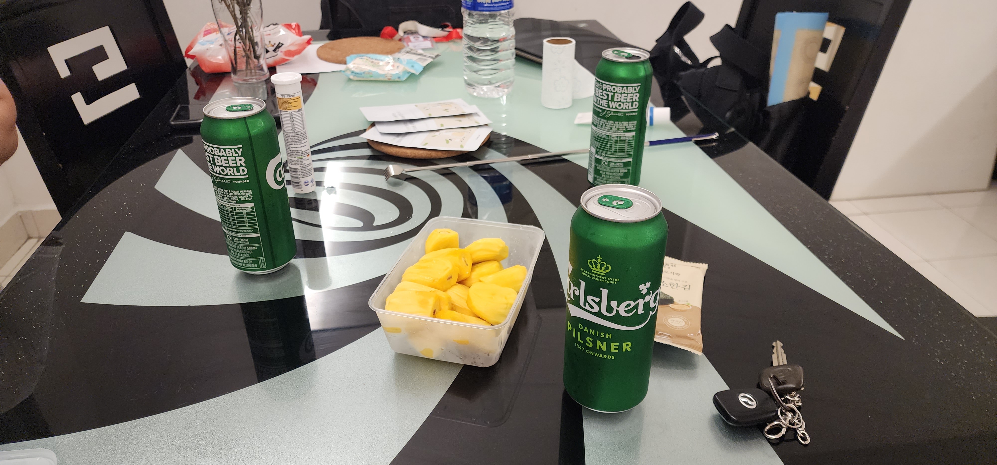 몇몇 가게를 발품 팔아본 결과 지금 시즌에는 생두리안을 파는 곳이 없었기에 ㅋㅋㅋ 어쩔 수 없이 그냥 잭푸르트와 칼스버그로 만족할 수 밖에 없었다.