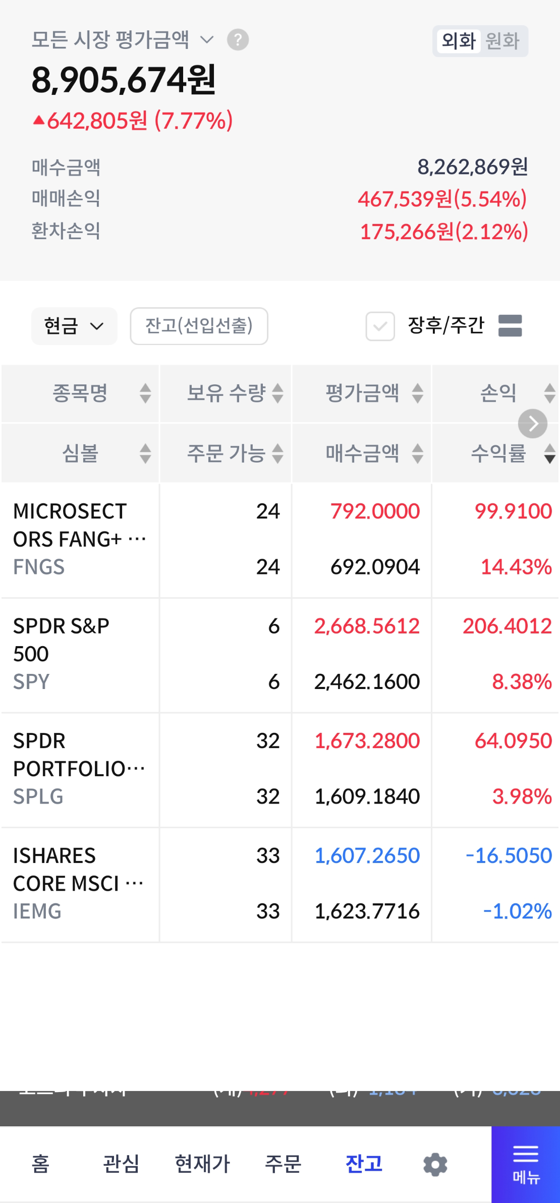 FNGS 5개 / IEMG 5개 / SPLG 7개를 매수했다.
