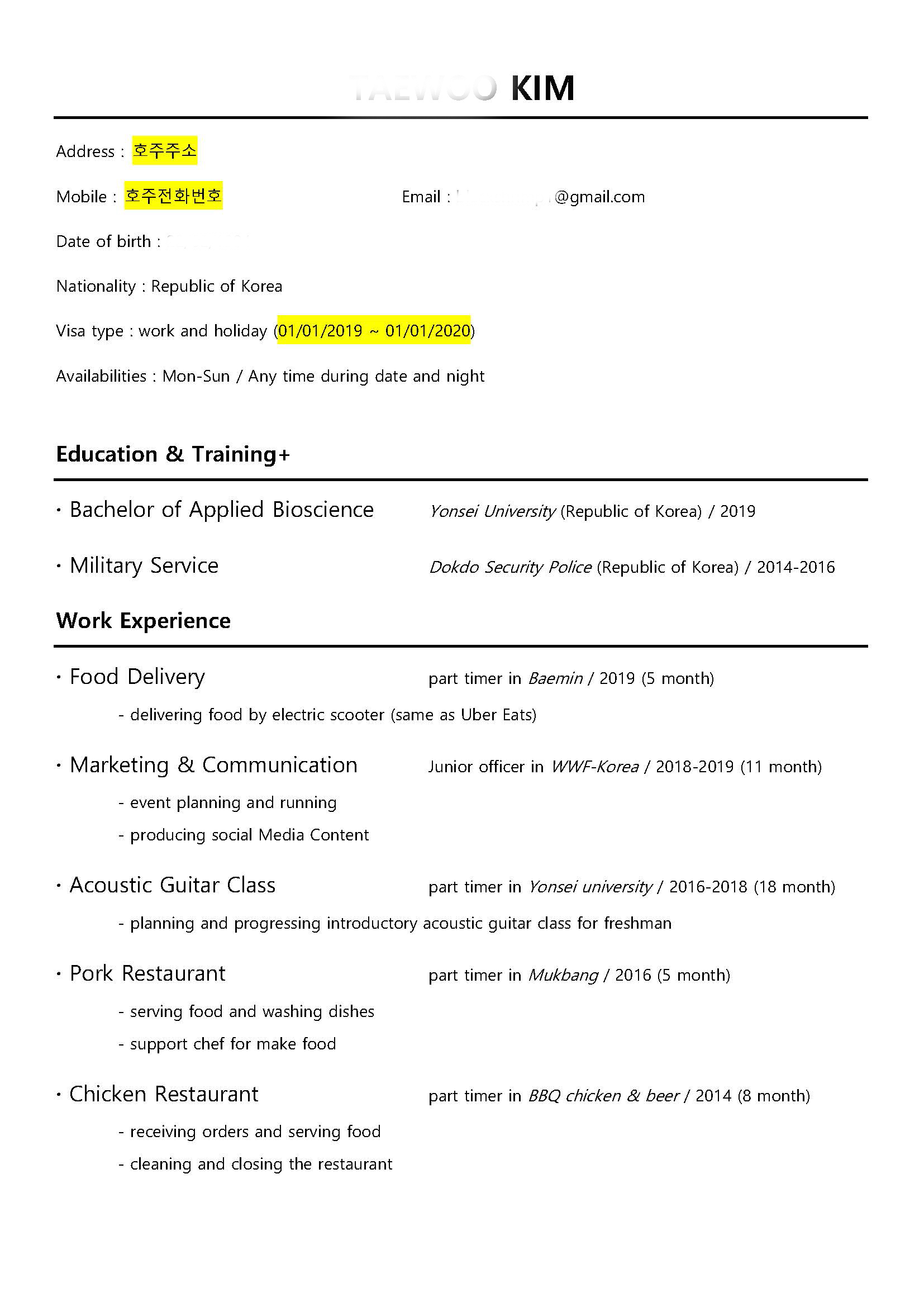 CV랑 resume가 둘다 쓰이는 것 같던데. 일단 인터넷에 돌아다니는 이력서와 시드니 워홀러 친구가 보내준 이력서를 참고해서 만들었다.