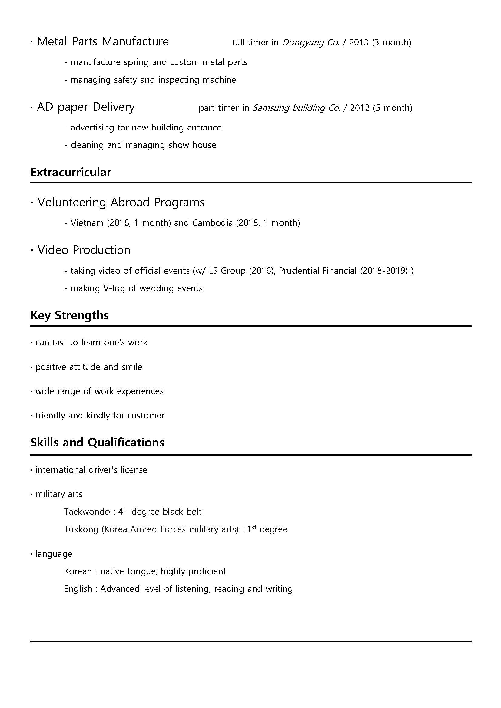 한국 이력서라면 절대 안썼을ㅋㅋㅋㅋㅋㅋ무예(military art라 한다는것도 이번에 알았다) 자격증도 열심히 써주었다.
