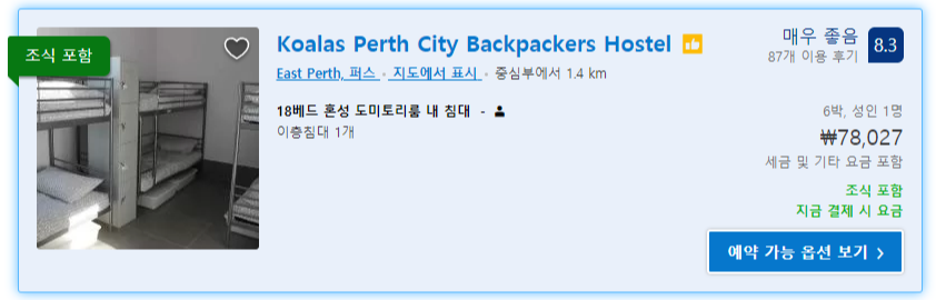 나는 Koalas Perth City Backpakers Hostel에 일주일을 예약했다.