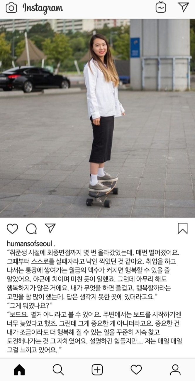 humans of seoul에 올라온 포스팅을 보았다. 행복을 보드에서 찾았다는 그녀의 이야기는 나에게도 영향을 주었다. 나도 마찬가지로 행복해지려고 여기 왔고, 첫 날 스완리버를 걸으면서 너무나도 행복해했었던 기억이 있다.